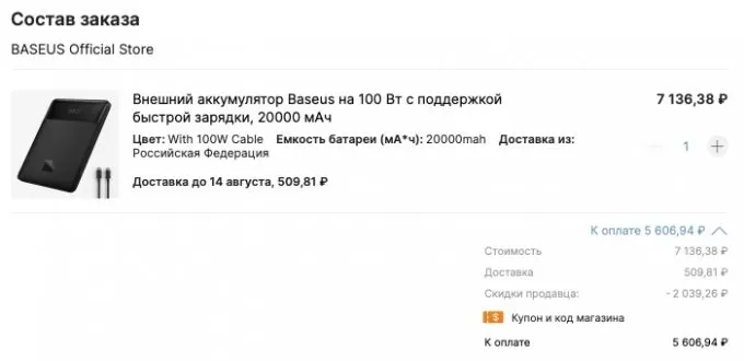 Сейчас на AliExpress топовый аккумулятор Baseus Blade на 100 Вт можно урвать всего за 5607 рублей с быстрой доставкой по России. Не забудьте забрать купоны продавца для получения максимальной скидки на товар.