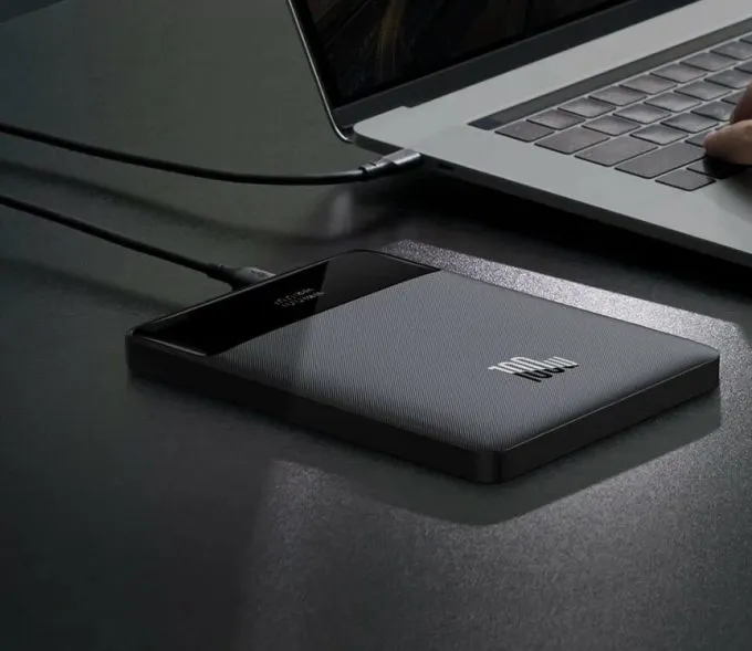 На лицевой стороне расположен небольшой дисплей. Он отображает уровень заряда аксессуара, выдаваемую мощность и предполагаемое время окончания зарядки подключённого гаджета. Верхний торец занимает кнопка включения, два порта USB-A мощностью до 30 Вт и два USB-C на 100 Вт.