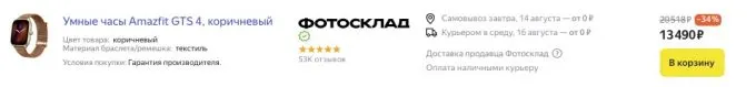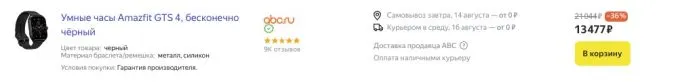 Сейчас на Яндекс.Маркете топовые Amazfit GTS 4 в чёрном цвете с силиконовым ремешком можно купить всего за 13 477 рублей. Золотистая версия с тканевым ремешком обойдётся чуть дороже — в 13 490 рублей. А с кэшбеком некоторых банков вы можете сэкономить ещё 1300 рублей.
