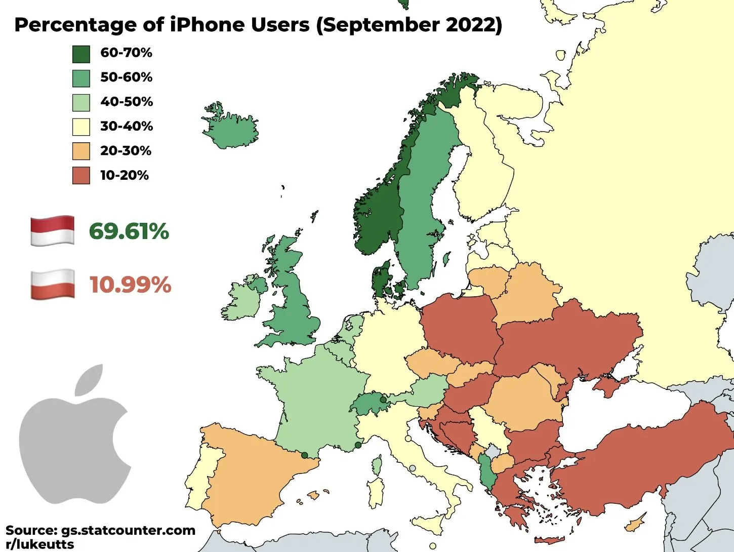 В сети опубликовали статистику, которая демонстрирует, насколько смартфоны Apple популярны в разных странах Европы. Не все так однозначно, хотя есть тенденция — в более богатых странах iPhone выбирают чаще, чем Android-девайсы.