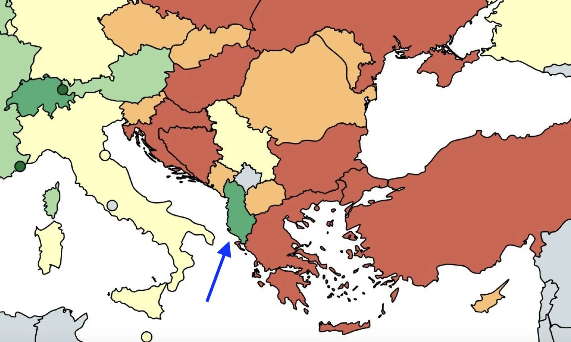 При максимальном показателе — 60-70% пользователей iPhone — территории государства закрашивается зеленым цветом. При минимальном, когда смартфоны Apple выбирают 10-20% граждан, цвет — красный. Из инфографики следует, что жители обеспеченных стран на северо-западе континента чаще выбирают телефоны американского бренда — посмотрите на Великобританию, Норвегию, Швецию, Францию.