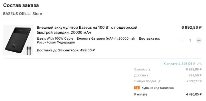 Прямо сейчас топовый аккумулятор Baseus Blade на 100 Вт можно урвать на AliExpress всего за 4495 рублей с учётом купонов магазина.