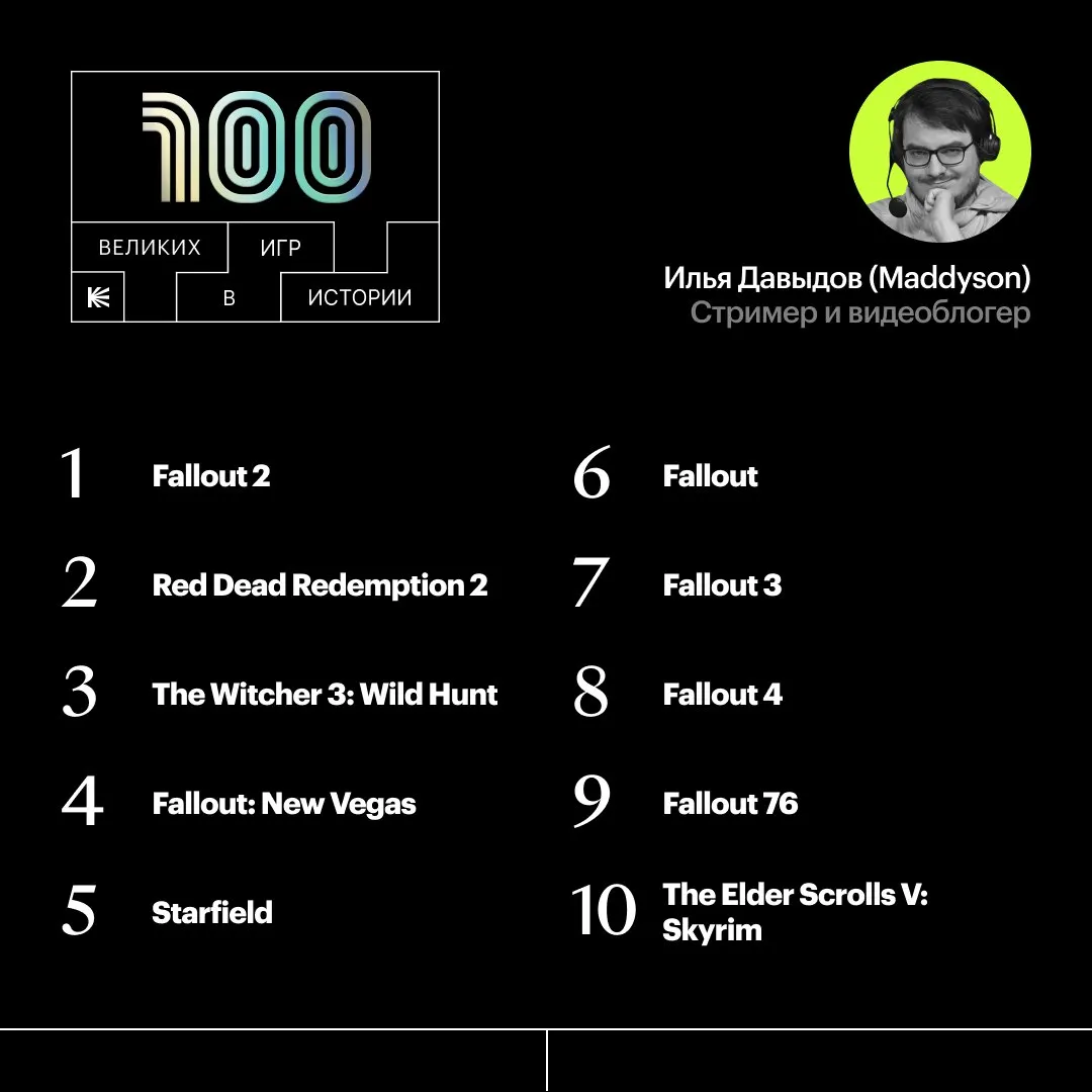 По версии Ильи, лучшей игрой всех времен и народов является Fallout 2. В топ-3 попали Red Dead Redemption 2 и «Ведьмак 3». На пятом месте оказался недавний релиз Starfield, кроме первого места игры серии Fallout заняли также 4, 6, 7, 8 и 9 места.