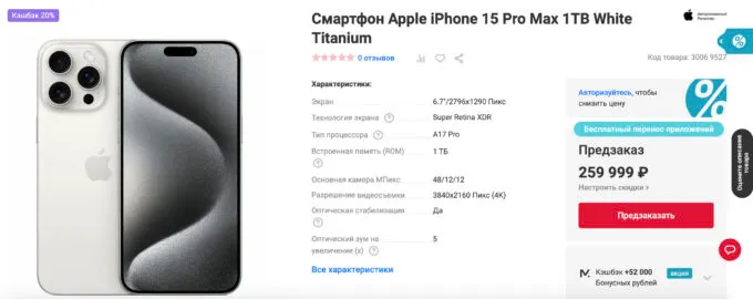 Поражает, что за базовый 15 Pro Max придется отдать почти 200 тысяч рублей. Отчасти потому, что модели 128 Гбайт в линейке «максов» нет, минимальная версия имеет 256 Гбайт памяти. В подарок за заказ дают кэшбек в размере 20%. Щедро, конечно: например, за покупку 15 Pro Max (1 Тбайт), который оценили в 259 999 рублей, вы получите 52 тысячи баллов.