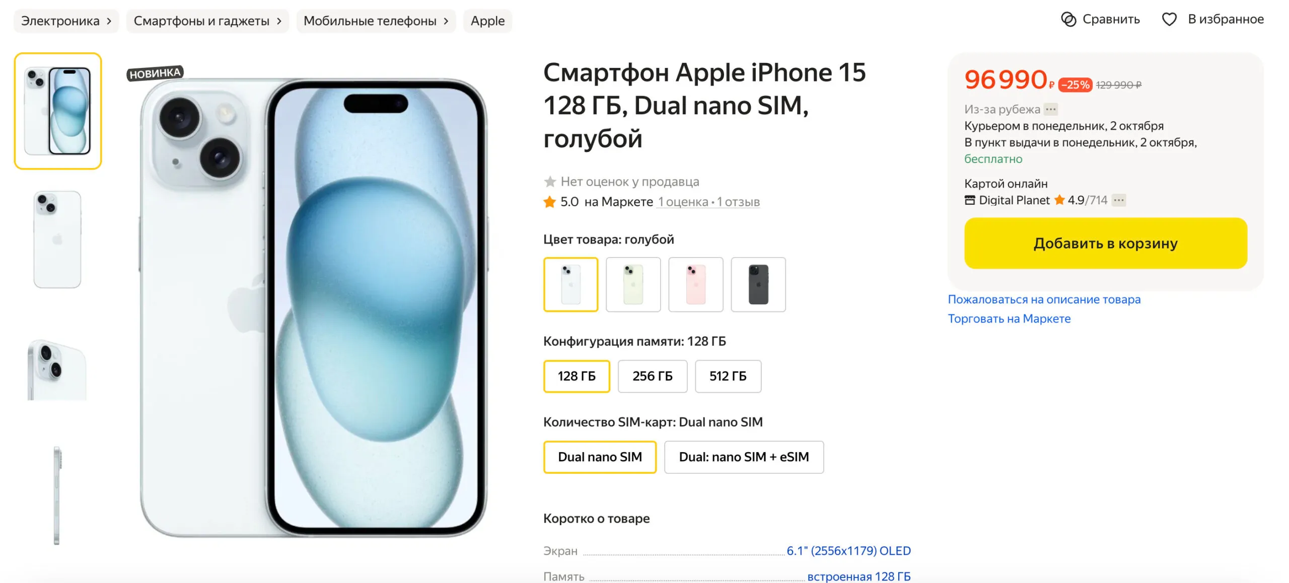 iPhone 15 с накопителем 128 Гбайт можно приобрести на Маркете за 96 990 рублей. Скидка серьезная: во-первых, ценник упал ниже психологической отметки в 100 тысяч рублей. Во-вторых, в «М.Видео», re:Store и прочих официальных магазинах за аппарат просят 130 тысяч и больше.