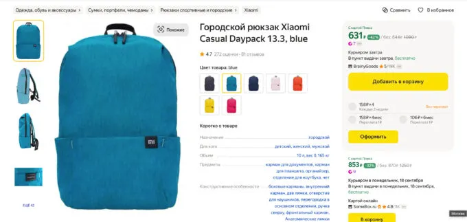 Как это работает? Ценники не всех, но многих товаров отмечены зелёным цветом. Если видите именно такие расценки, значит они указаны именно с учётом оплаты по Карте Пэй — помимо этого рядом указан прайс при оплате другими картами. Например, с картой «Яндекса» рюкзак Xiaomi стоит 631 рубль, без неё — 644 рубля.