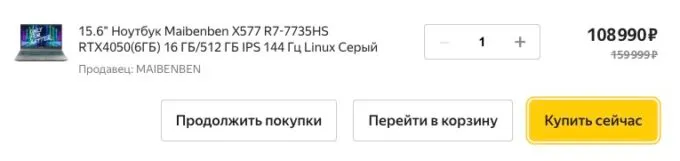 Местные ритейлеры оценили Maibenben X577 в 160 тысяч рублей, но сейчас на Маркете его можно урвать всего за 108 990 рублей. Некоторые банки также готовы отсыпать жирный кэшбек за покупку на этой площадке.