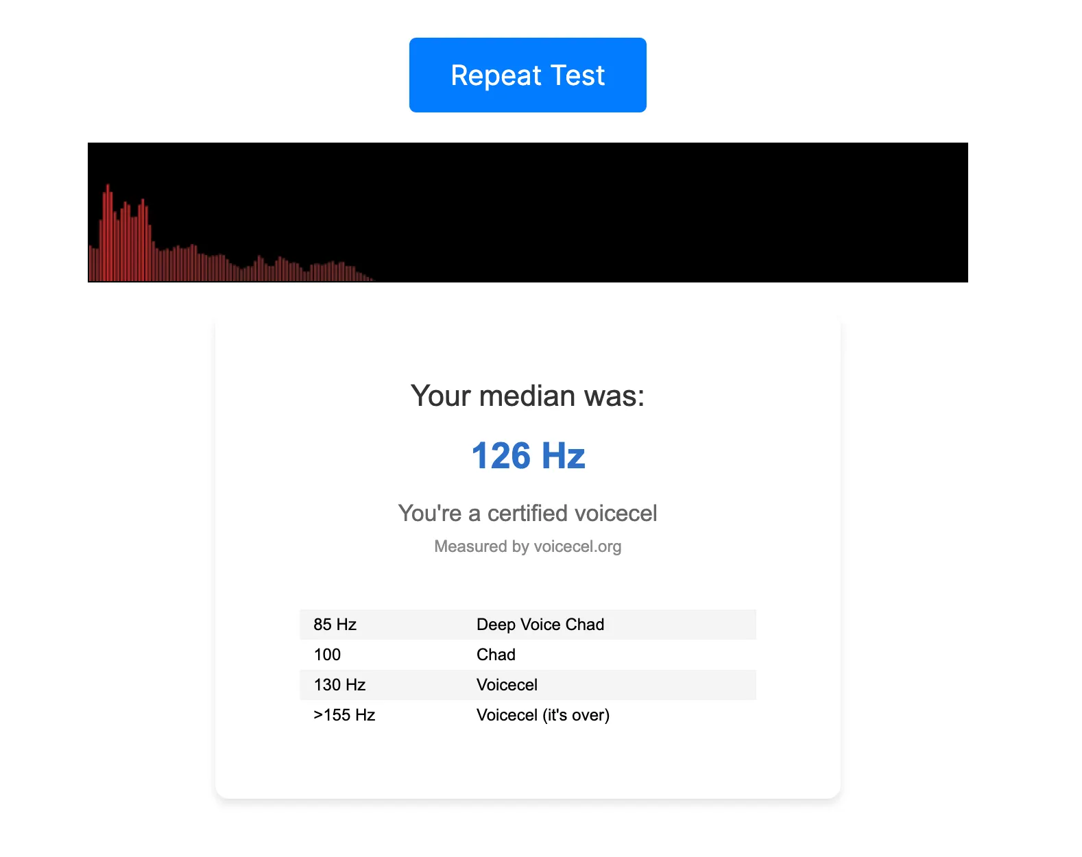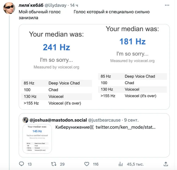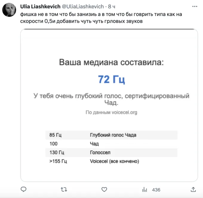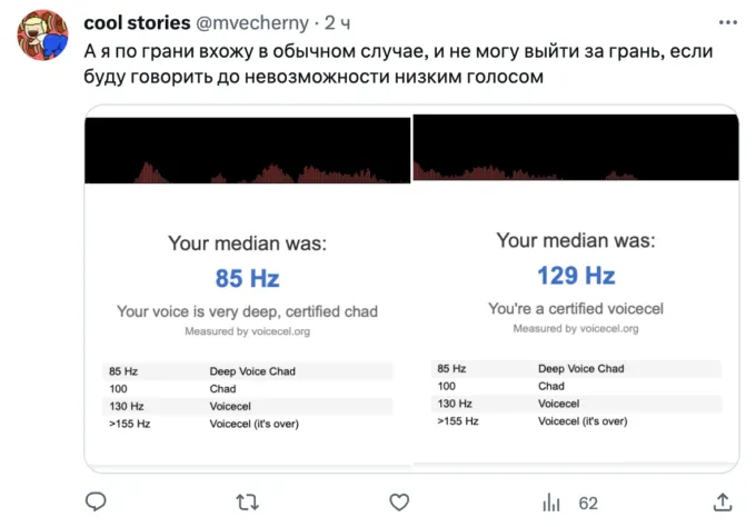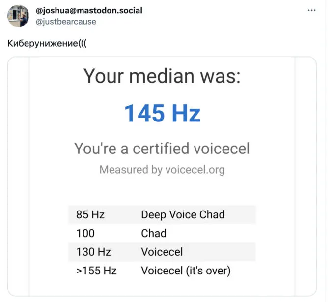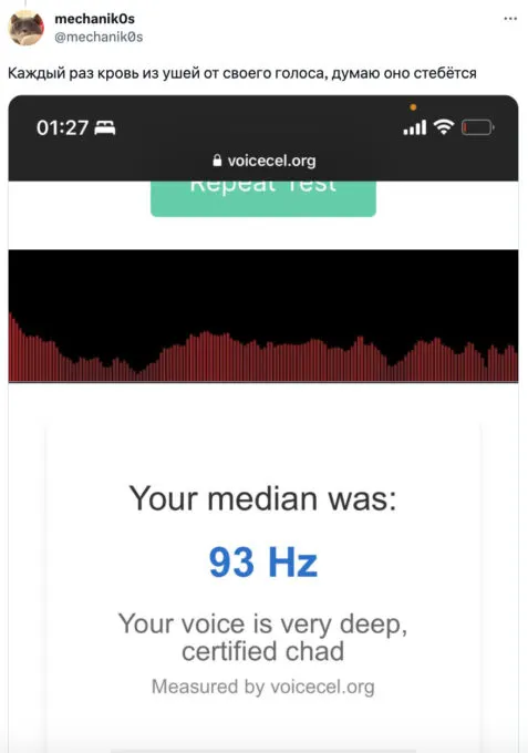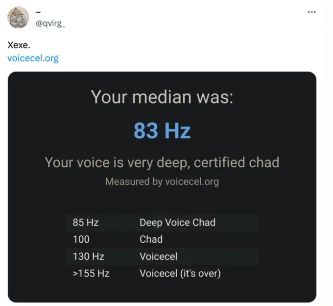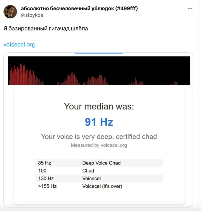 Сервис измеряет частоту голоса и показывает, к какой категории относится юзер. Считается, что чем тембр голоса ниже и глубже, тем он красивее. Такой голос имеют Чады (из мемов) — сильные и уверенные в себе люди. Напротив, люди с высоким тембром голоса неприятны окружающим — их писки никого не интересуют.