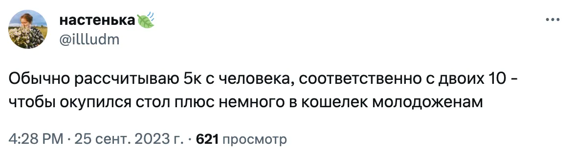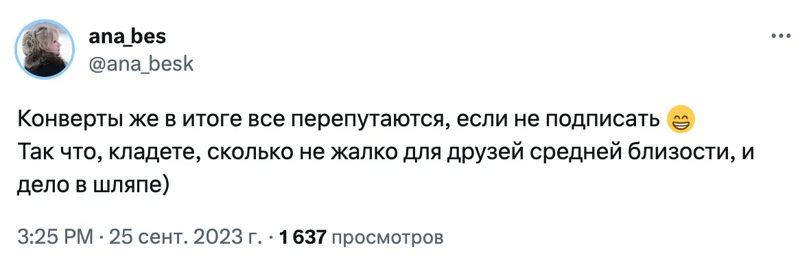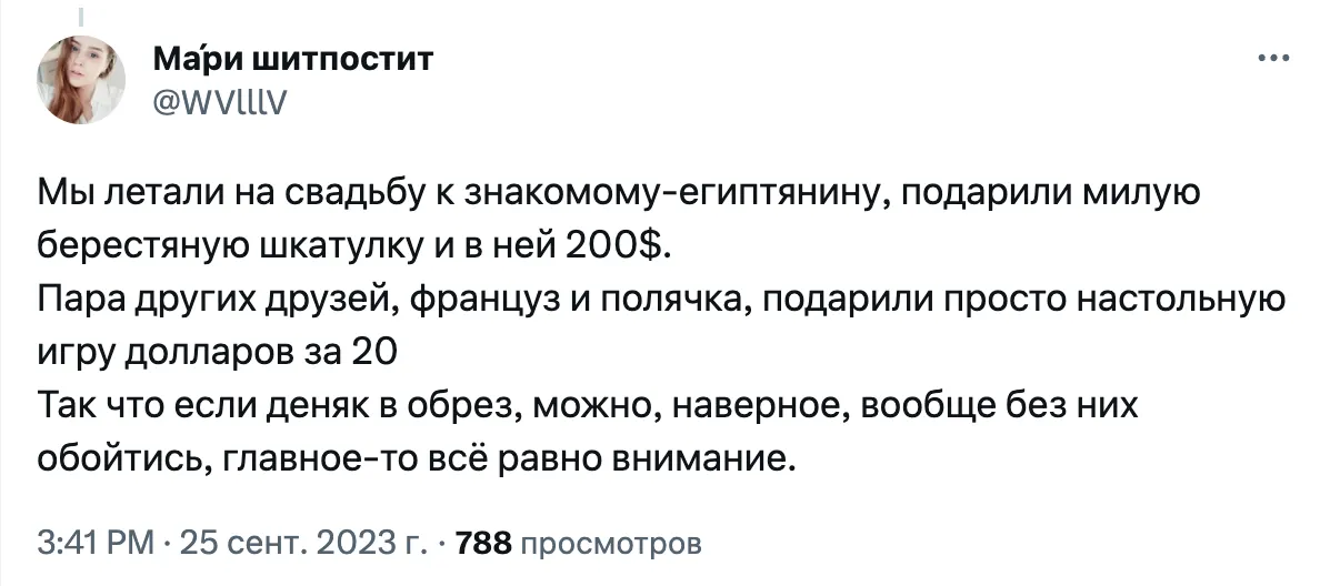 Это вопрос задала у себя в твиттере (Х) пользователь под ником «лисички в сметане». Судя по всему, девушка вместе со своим мужем собирается на торжество к «средней близости друзьям». Короче, ситуация, с которой неминуемо столкнется каждый.