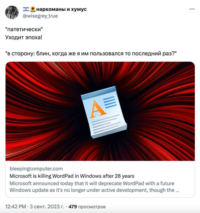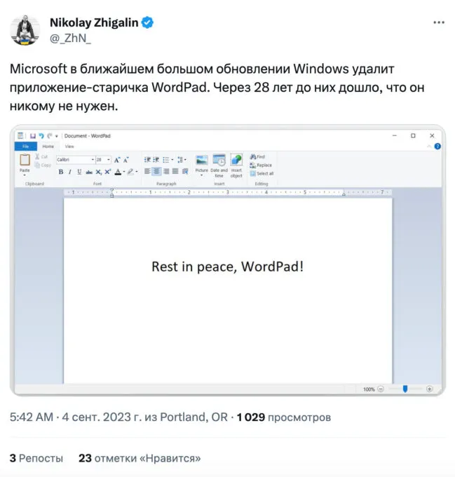 Реакция пользователей твиттера — жаль, конечно, этого добряка, но WordPad мы почти не пользовались.
