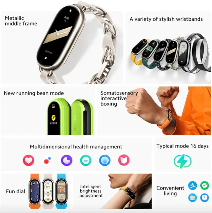 Mi Band 8 (в России этот девайс известен под названием Smart Band 8) имеет прямоугольный корпус-капсулу, 1,62-дюймовый AMOLED-дисплей, новое крепление — устройство можно носить на руке, повесить на цепочку или прикрепить к сумке. Как и в прошлых поколениях, тут есть пульсометр и пульсоксиметр.