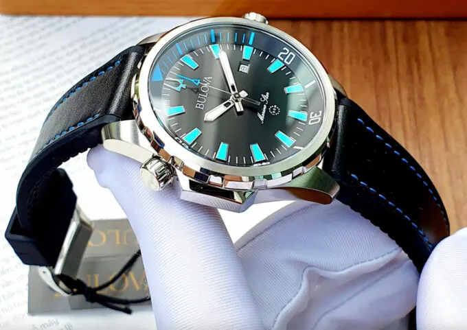 Классические кварцевые часы с крепким стальным корпусом и циферблатом с хорошо читаемыми элементами, прикрытым минеральным стеклом. Часы не боятся сложных погружений, они будут работать на глубине до 100 метров. Модель выделяет броский дизайн, но защищены они по полной программе. Часы от Bulova будут хорошо выглядеть и с классическим костюмом, и с военным кителем.