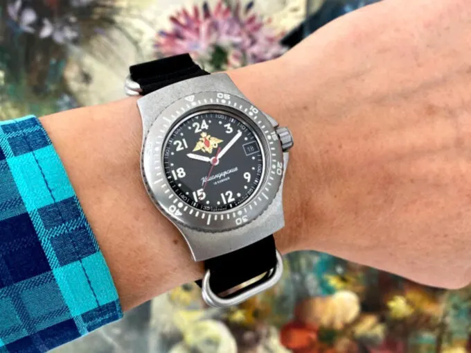 Необычная модель «Командирских» — идеальный девайс для тех, кто хочет нырнуть на дно. Часы сделали специально для водолазов. Во-первых, с ними можно погружаться на глубину до 200 метров, во-вторых, цифры и стрелки светятся в темноте, в-третьих, ремешок можно идеально зафиксировать на запястье или гидрокостюме. Есть функция автоподзавода, безель можно поворачивать.