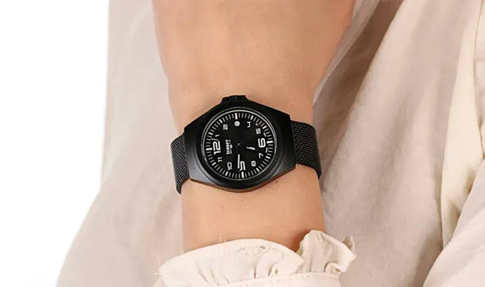 Интересный вариант с кварцевым механизмом, большими стрелками, корпусом из неражавеющей стали и текстурированным пластиковым ремешком. Отдельное внимание заслуживает безель — в него частично интегрирована солнечная панель, поэтому автономность часов сумасшедшая. Есть влагозащита — до 200 метров.