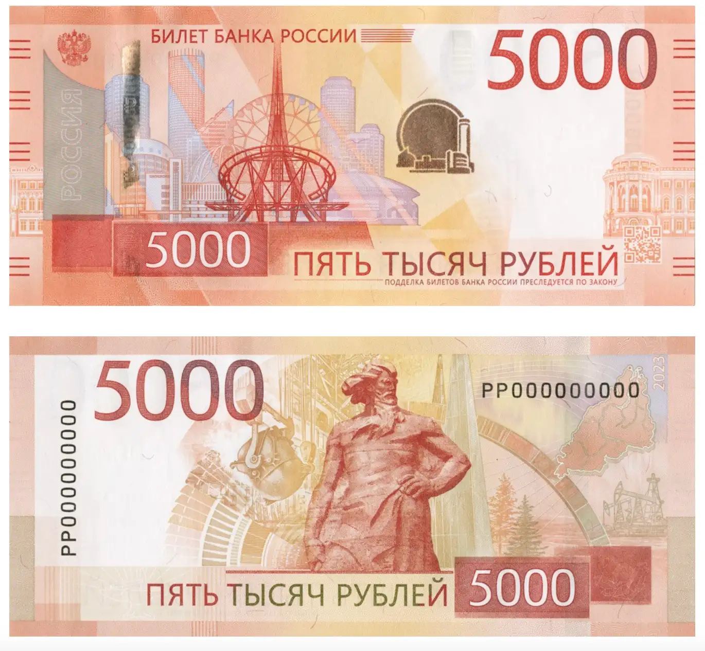 На пятитысячной купюре разместили известные объекты Екатеринбурга и Уральского федерального округа. Спереди находится стела «Европа — Азия», сзади — памятник «Сказ об Урале» в Челябинске, стела «66 параллель» (Полярный круг) в Салехарде.