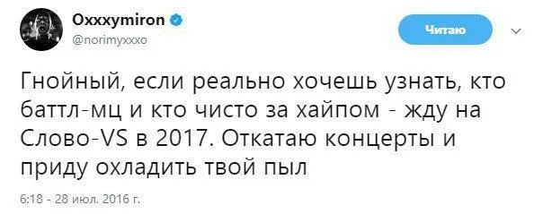 Твит, который изменил жизнь Гнойного. После победы в главном батле всея Руси Слава выпустил одноименный трек, а сайт The Flow поставил шутливую песню на седьмое место в списке главных композиций 2017 года.