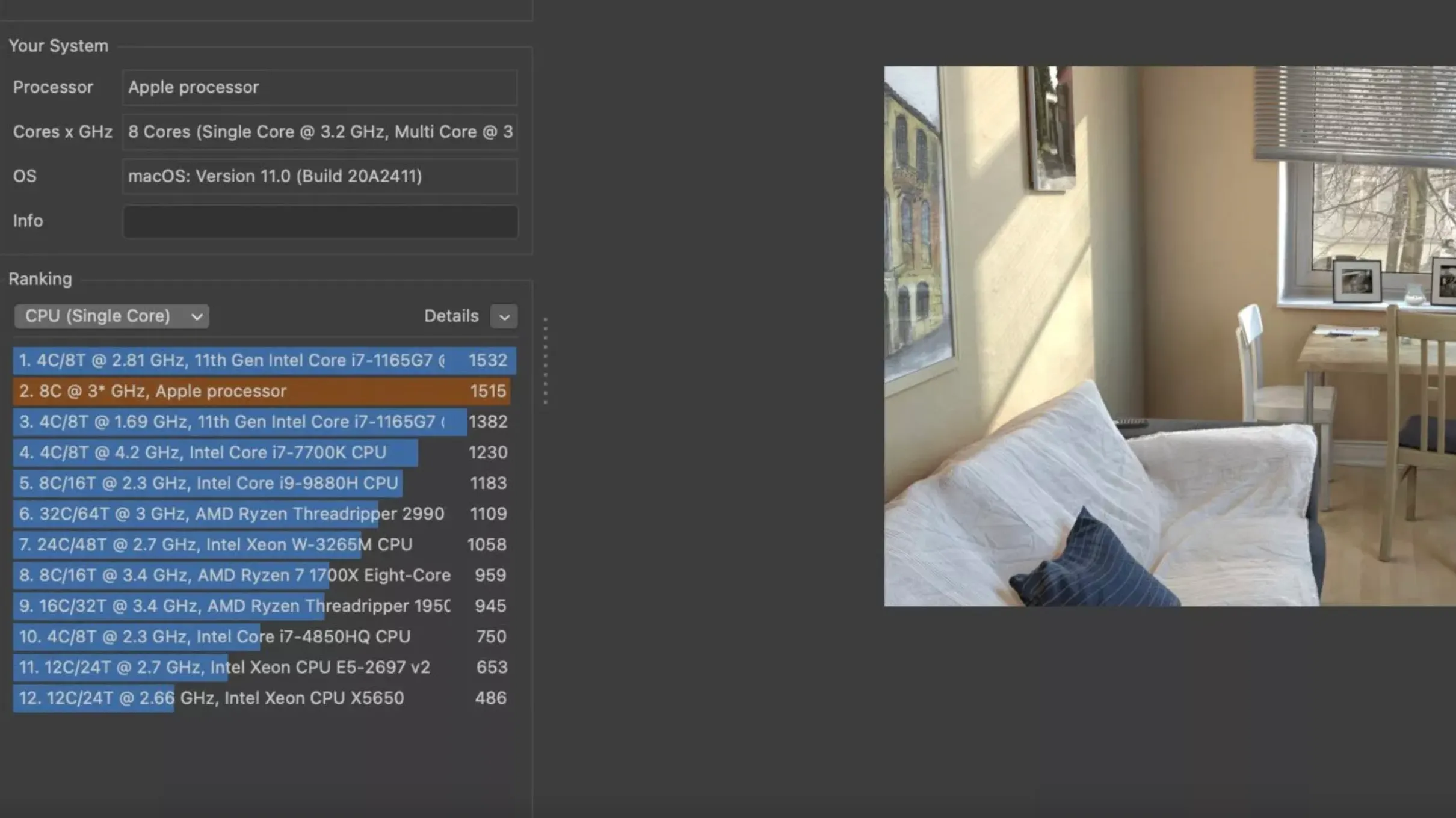 Максимально честно мощь Air на M1 с 8 Гбайт ОЗУ смогут оценить тесты. Так, весной 2022 года MacBook Air проверили в бенчмарке Cinebench. Модель получила 1515 баллов, обогнав многие процессоры — Intel Core i7-7700K, Intel Core i7-1060NG7, AMD Ryzen Threadripper 2990 и другие чипы.