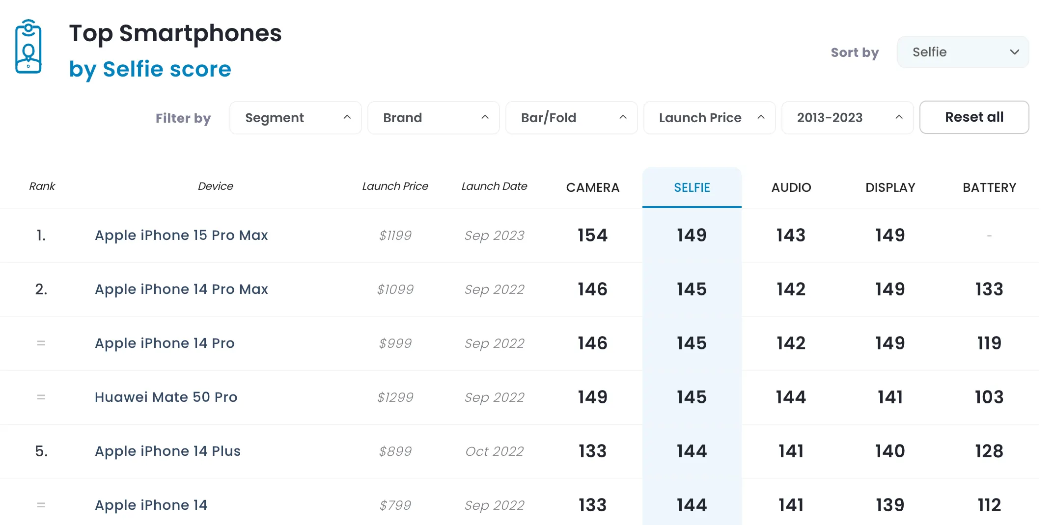 Интересно, что в iPhone 15 Pro Max встроена та же передняя камера, что и в iPhone 14 Pro Max — 12-мегапиксельный сенсор с диафрагмой f/1,9. То есть за повышение качества в большей степени отвечают нейросети и мощный процессор. Это подтверждает тот факт, что iPhone 14 Pro Max оказался на втором месте: