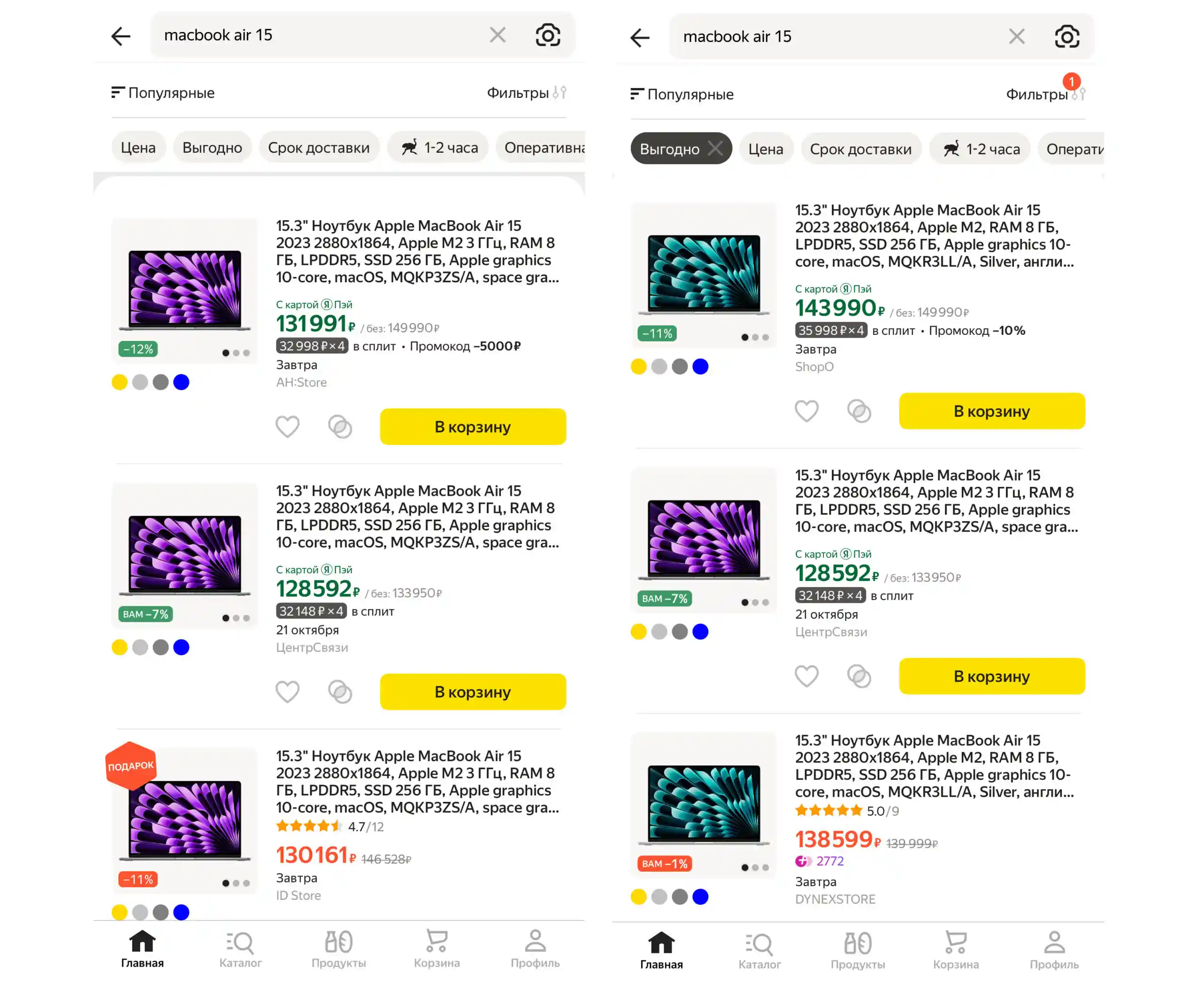 Попробуем найти на площадке MacBook Air 15. Без фильтра «выгодно» Маркет покажет нам первыми предложения за 131 991 рубль и 128 592 рубля. Применяем фильтр и видим цены 143 990 рублей и 128 592 рубля.
