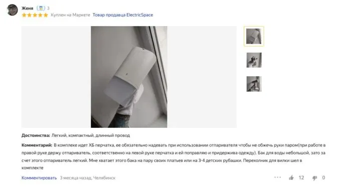 В комплект входит перчатка, чтобы не обжечь руку во время отпаривания, поскольку аппарат нагревается до температуры в 130 градусов всего за 30 секунд. Резервуара объёмом 160 мл хватит для разглаживания 6 футболок или 2 рубашек. Важно понимать, что всё зависит от плотности и качества материала одежды.