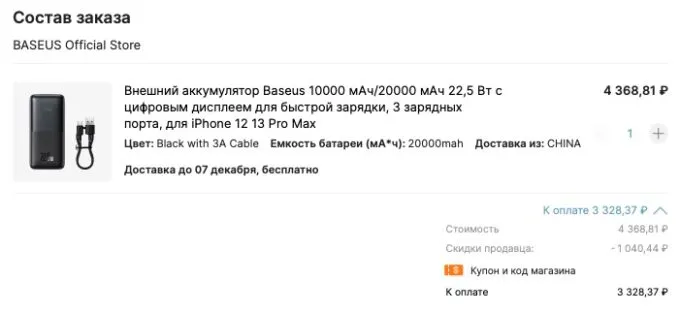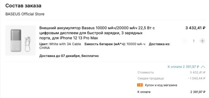 Обычно Baseus Bipow Pro на 10 000 мАч стоит 5720 рублей, но сейчас на AliExpress его можно урвать всего за 2392 рубля с купонами продавца. Версия на 20 000 мАч обойдётся всего в 3330 рублей вместо 7282 рублей.