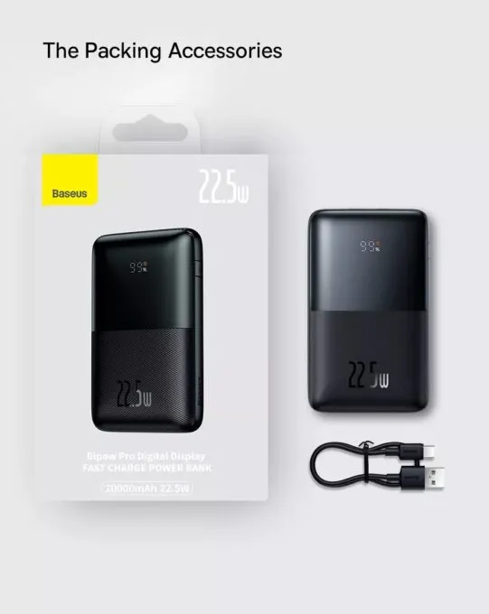 Максимальная мощность зарядки в обе стороны — 22,5 Вт. Спереди есть небольшой дисплей, который отображает уровень заряда «банки» и режим зарядки. Бонусом в комплекте идёт короткий кабель USB-A/USB-C, который удобно таскать с собой. Отдельного респекта Baseus заслуживает за две нестандартные расцветки, помимо привычной чёрной и белой.