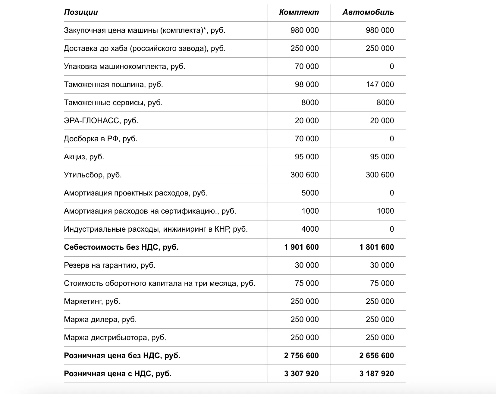 А не дешевле собирать иностранные тачки в России, а не импортировать? Не все так просто. Авторы подсчитали, что с учетом НДС импортированный автомобиль будет стоить 3,187 млн рублей, собранный на российском предприятии — 3,3 млн рублей.