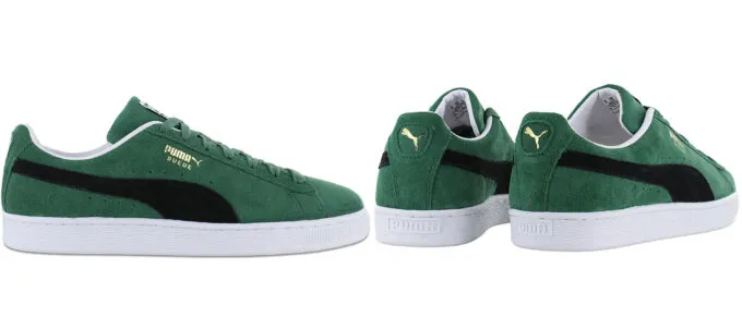 Теперь к обуви. Начинаем с зелено-черных кед Puma Suede Classic XXI. И да, это классика. Модель обладает узнаваемым дизайном и пачкой крутых фишек. Тут и стелька OrthoLite, отвечающая за комфорт при ходьбе, и сразу несколько логотипов немецкого бренда, и качественный верх из замши.