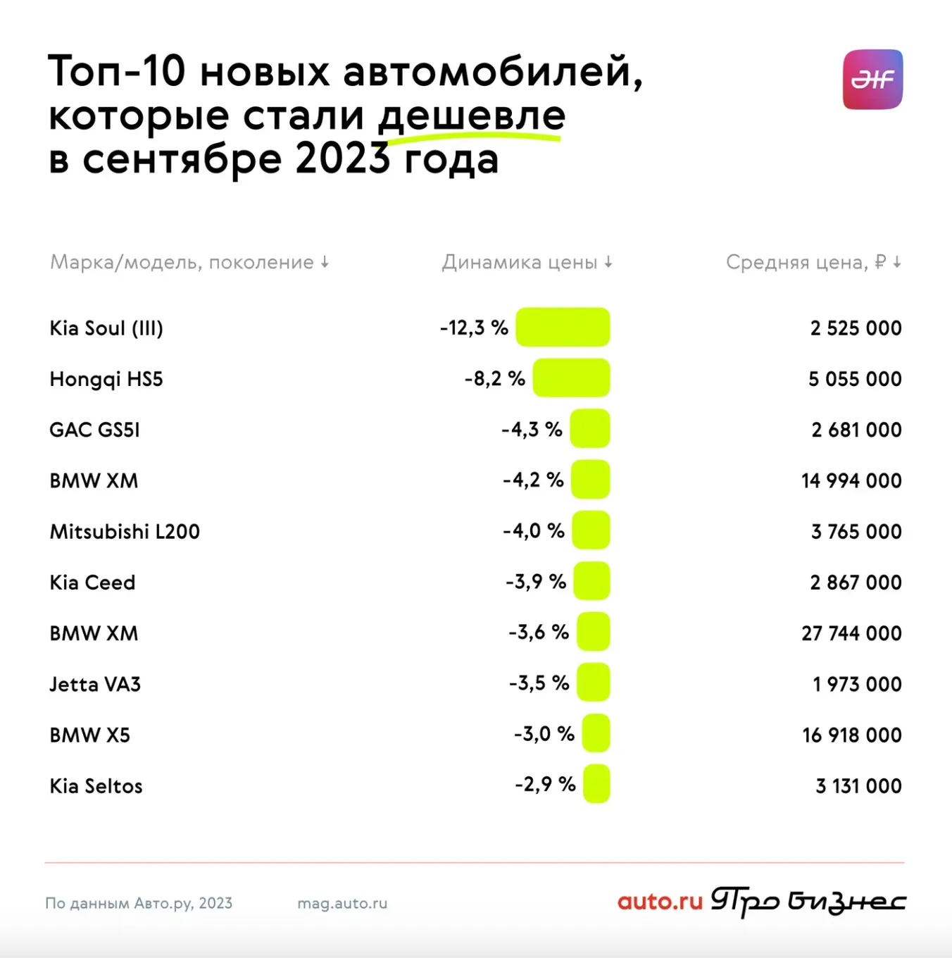 Самым подешевевшим за месяц новым автомобилем оказался Kia Soul 3 поколения, ценник которого обрушился на 12,3% — до 2,5 млн рублей. На втором месте оказался Hongqi HS5 — 8,2% или до 5 млн рублей, на третьем — GAC GS5I — 4,3% или до 2,6 млн рублей.