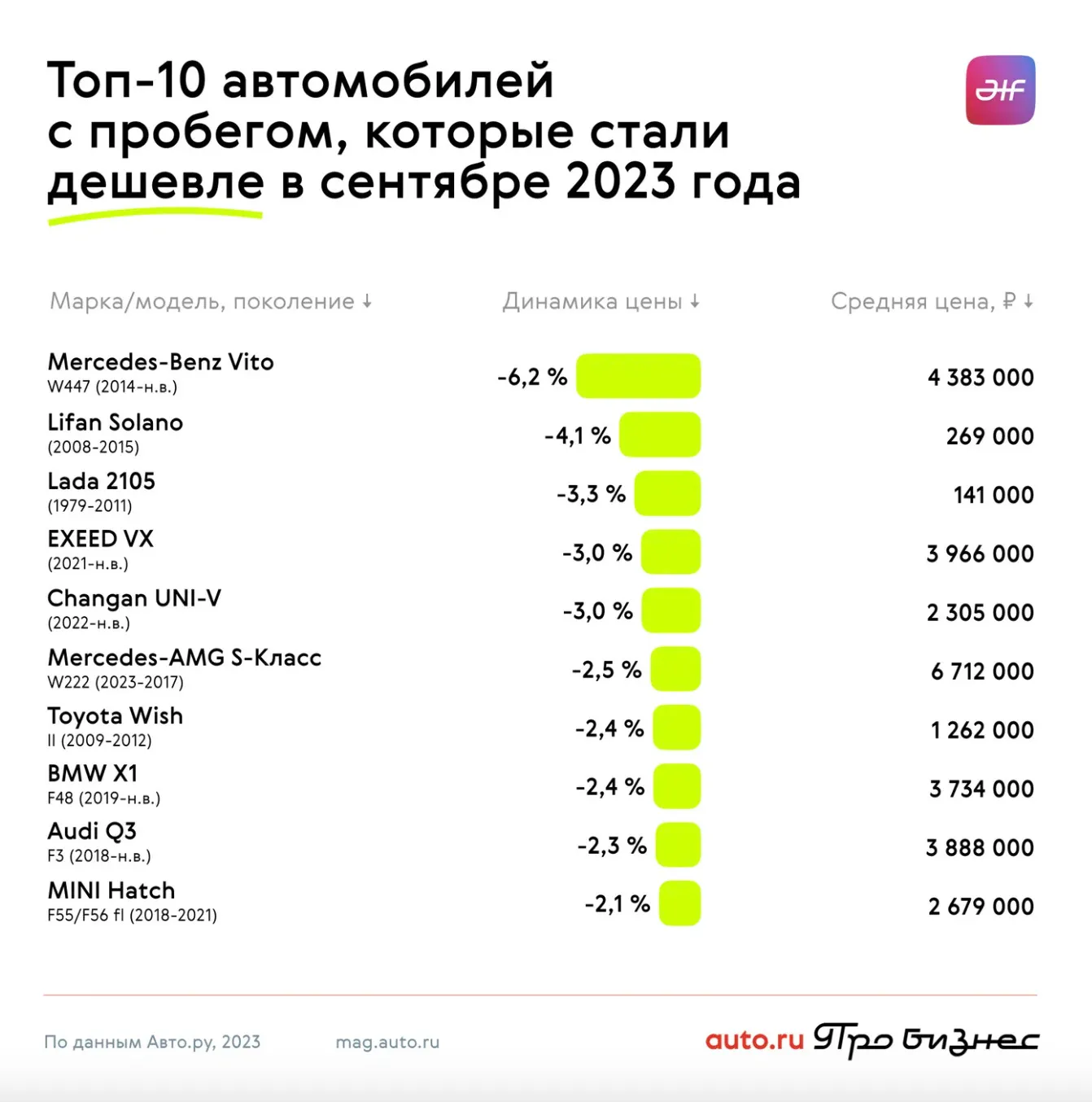 Среди подержанных машин заметнее всего подешевел Mercedes-Benz Vito — ценник снизился на 4,1% до 4,3 млн рублей. В топ-3 попали Lifan Solano — 269 тысяч рублей, Lada 2105 — 141 тысяча рублей.