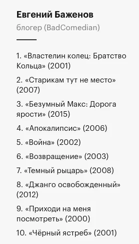 На первое место Бэд поставил первую часть «Властелина колец» – «Братство Кольца», вторым в его списке оказался триллер братьев Коэнов «Старикам тут не место», а тройку замкнул постапокалиптичный «Безумный Макс: Дорога ярости». Но самые любопытные тайтлы пролетели мимо призовых мест.