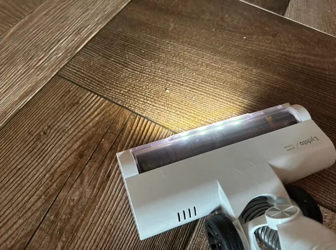 Это бюджетный пылесос, но он имеет подсветку — мелкий мусор даже при солнечном свете вполне различим. Кроме того, щетка основной насадки крутится, тем самым дополнительно собирая сор.