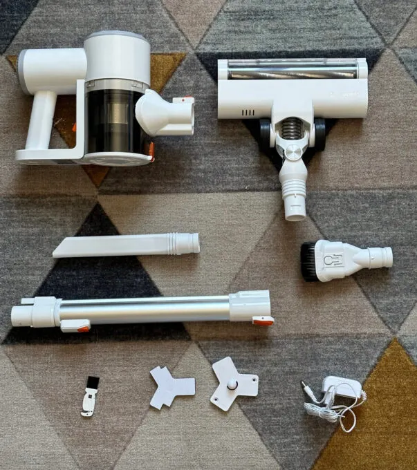Комплект Lydsto V9 спартанский, но все базовые вещи есть. Кроме самого пылесоса присутствует основная насадка, удлинительная трубка, дополнительная насадка для уборки в труднодоступных местах, зарядный провод с адаптером и кронштейн на стену.