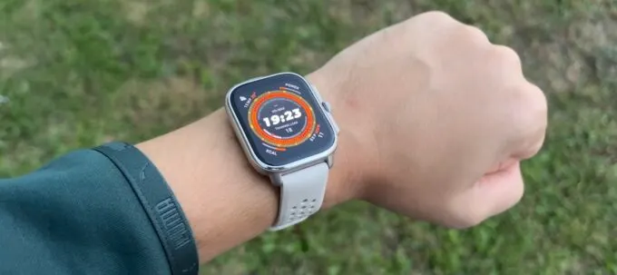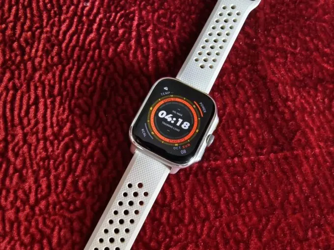 Часы предлагают прямоугольный корпус под эппловский титан, но из алюминия, изогнутые грани и две физические кнопки с колёсиком для управления. Здесь установлен 1,75-дюймовый AMOLED-дисплей с разрешением 390×450 пикселей и функцией Always-On Display. В целом он выглядит довольно крупным.