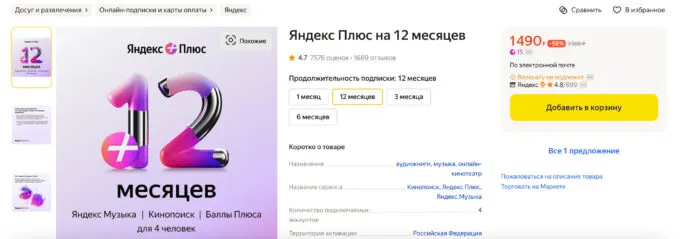 Также годовую подписку можно взять на Маркете, где она стоит 1490 рублей. Отдельно радует, что и в «М.Видео», и на Маркете можно списать баллы (при их наличии) и забрать подписку на год за 1 рубль.