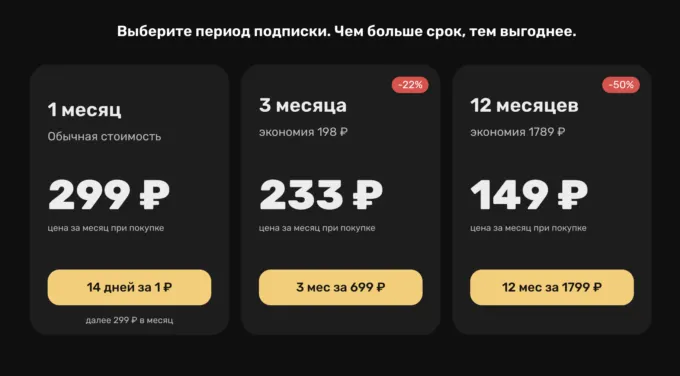 На «Кинопоиск» нельзя подписаться отдельно — сервис входит в подписку «Яндекс Плюс». 1 месяц доступа стоит 299 рублей, но можно сэкономить. Например, в «М.Видео» годовой пакет продают за 1495 рублей (получается 124 рубля за месяц).