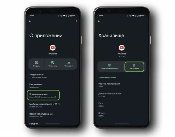 Впрочем, на Android-устройствах есть возможность почистить память, удалив кэш. Для этого открываем настройки смартфона, затем заходим в раздел «Приложения» и находим в списке YouTube. После этого выбираем «Хранилище и кэш» и нажимаем «Очистить кэш».