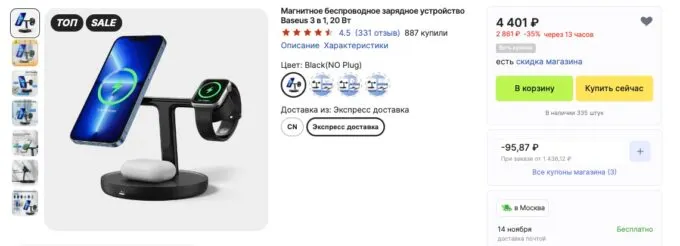 Обычно за беспроводную зарядку Baseus Wireless Charger Swan 3-in-1 просят под 6 тысяч рублей, но 11 ноября на AliExpress полезнейшую вещь можно забрать за 2860 рублей. Причём товар обещают доставить мгновенно по всей России.