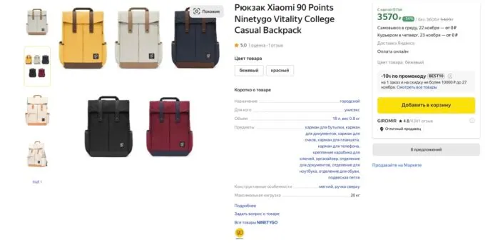Обычно за Xiaomi NinetyGo Vitality College Casual Backpack просят под 5 косарей, но сейчас на Яндекс Маркете его можно урвать всего за 3245 рублей по промокоду BEST10, а с кэшбеком некоторых банков он обойдётся ещё дешевле.