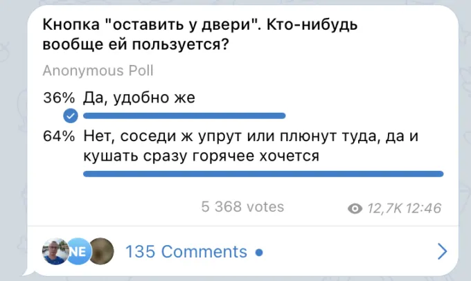 Рай для интровертов? Не надо здороваться с курьером, в панике искать штаны или переживать, что сотрудник службы доставки остался без чаевых. Не совсем — спустя двое суток после запуска опроса (более 5К ответов) положительно отреагировали лишь 36% респондентов.