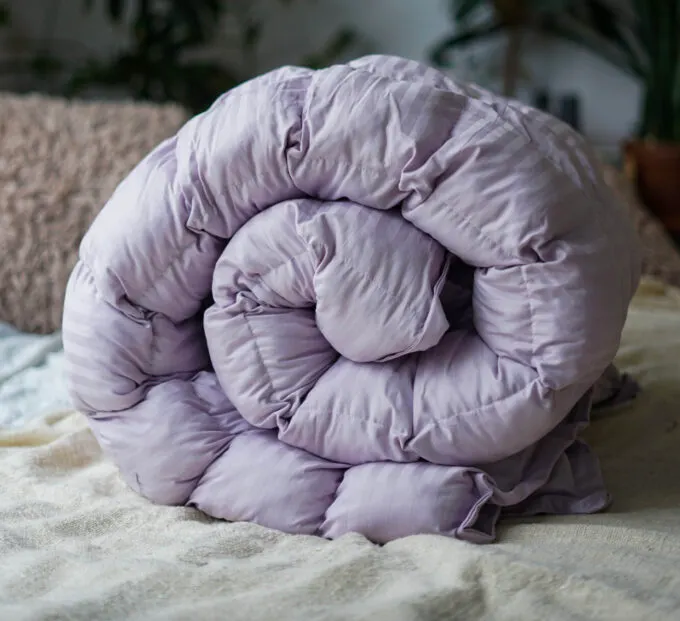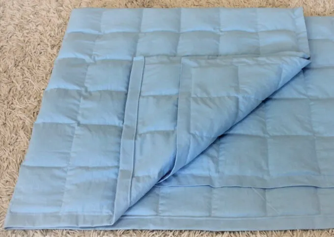 Самое тактильно приятное одеяло. Продается сразу комплектом — с пододеяльником на лето и зиму. Первый — хлопковый, второй напоминает плюш. Внутри находятся стеклянные микрогранулы, разделенные на квадраты размером 15х15 см. Есть тонкий утеплитель. Одеяло также можно стирать в машинке.