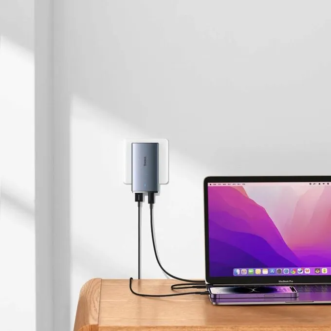 Главный флекс Baseus GaN5 Pro Ultra-Slim Fast Charger — ультратонкий металлический корпус цвета Space Grey c двумя портами и выходной мощностью в 65 Вт. На корпусе расположены разъёмы USB Type-C и USB Type-A. При одновременной зарядке двух гаджетов адаптер выдаст 45 Вт на первый порт и 20 Вт на второй.