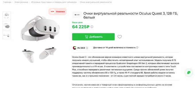 Например, мы обнаружили, что через платформу CDEK.Shopping очки виртуальной реальности можно заказать за 64 225 рублей на момент написания материала. И это действительно выгодный прайс, если учитывать отсутствие широких поставок в РФ и запросы от местных магазинов — обычно за дефицитный шлем просят больше 100 тысяч.