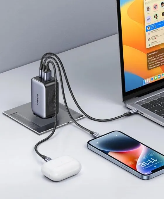 Ugreen GaN X может выдавать 65 Вт на оба порта USB-C, а на USB-A приходится максимум 22,5 Вт. При одновременном подключении трёх девайсов на первый порт USB-C будет подаваться 45 Вт, на второй —7,5 Вт, и на USB-A — 7,5 Вт. Так можно заряжать ноутбук и два смартфона.