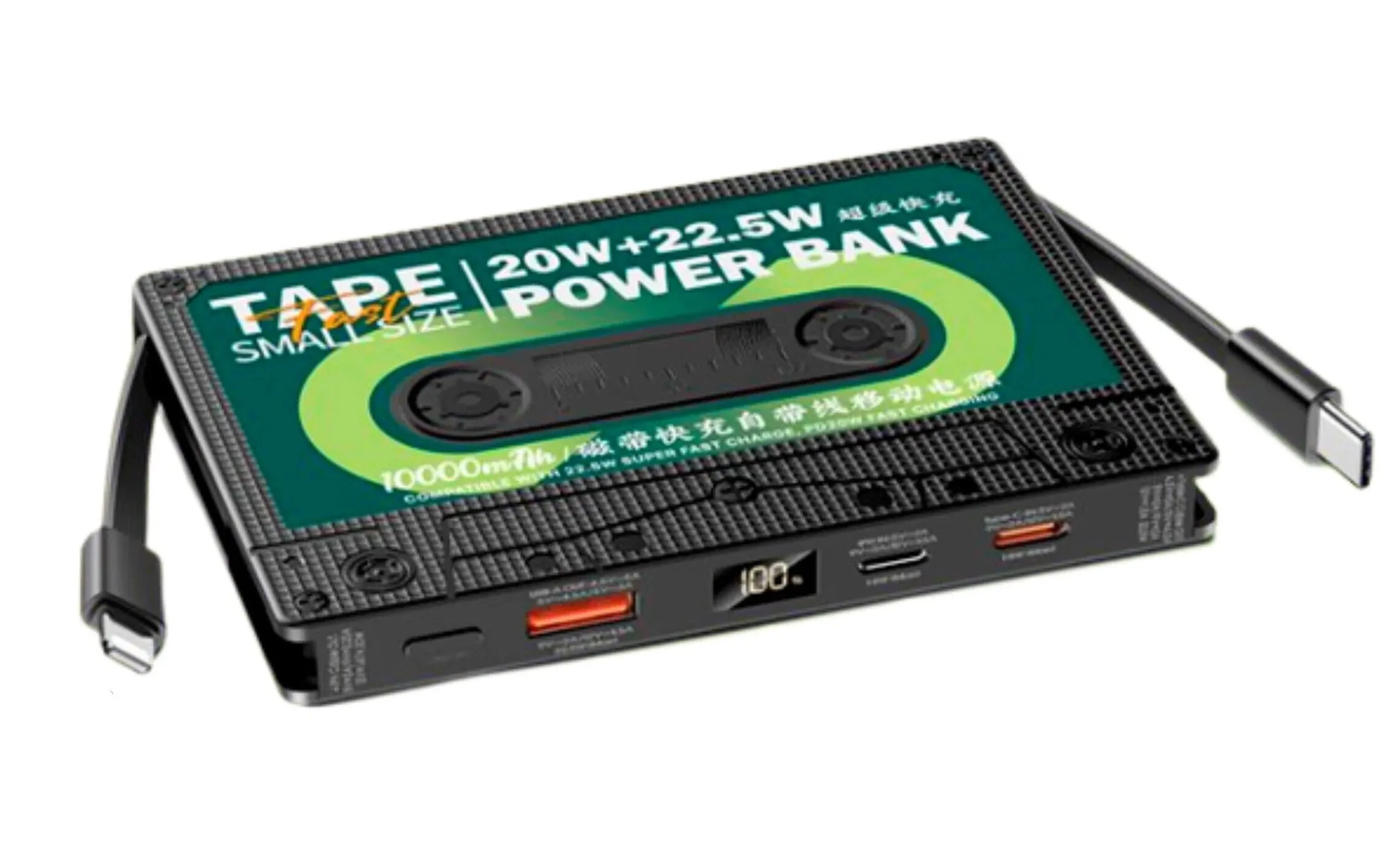 Всего 10 000 мАч, но титул самого стильного и надежного пауэрбанка подборки обеспечен. Батарея выполнена в стиле магнитофонной кассеты, устройство получило кабели Lightning и USB-C, поддерживает стандарт USB QC 3.0 PD, имеет LED-дисплей и три дополнительных разъема. Весит всего 185 граммов, помещается даже в передний карман рубашки.