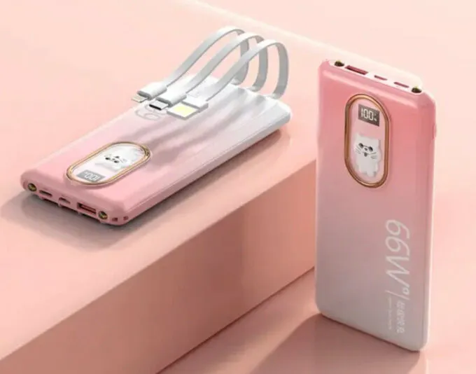 Еще одна универсальная модель с тремя проводами, LED-дисплеем с уровнем заряда батареи и кавайным котиком на передней панели. Отличительная фишка — наличие сразу двух фонариков, расположенных по краям устройства. Также есть прорезь для шнурка.