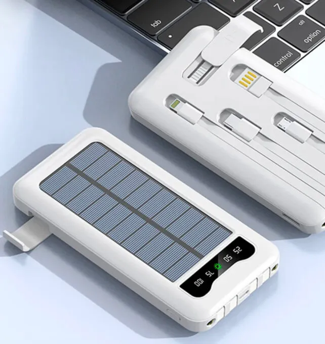 Крайне бюджетное решение. Но в комплекте есть четыре провода и встроенная солнечная батарея. Впрочем, пауэрбанк можно зарядить и от простой розетки. Есть защита от перезарядки, а также ножки, с которыми батарею можно использовать как подставку для телефона.