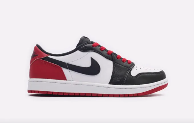 Простая классическая модель, очередная версия легендарных «джорданов». Имеет низкий верх, поэтому их можно носить с джинсами и брюками. Передняя часть черная, а шнуровка — красная.