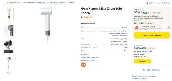 Скорее всего, ближе к праздникам цены на такие фены взлетят в космос, поэтому лучше купить девайс заранее. Сейчас на Яндекс Маркете бомбовый Xiaomi Mijia Hair Dryer H501 можно забрать за 4662 рубля по промокоду BEST10, а с кэшбеками некоторых банков он обойдётся даже дешевле 4 косарей.