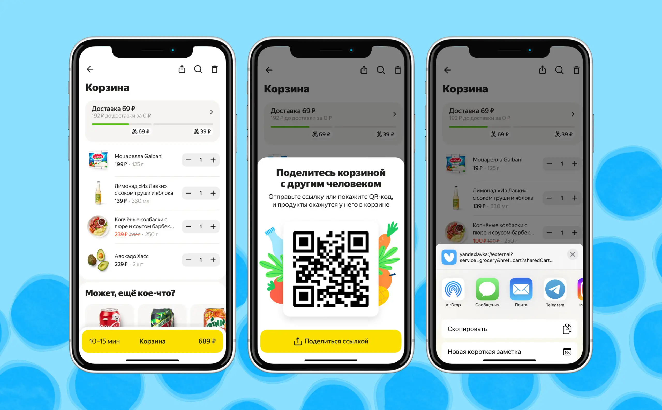С новой опцией можно набрать корзину в «Лавке» и кинуть близкому человеку ссылку или показать QR-код. По ссылке откроется приложение (или сайт, если на устройстве нет аппа) с корзиной с продуктами. Получатель сможет либо дополнить ее и передать дальше, либо оформить заказ.